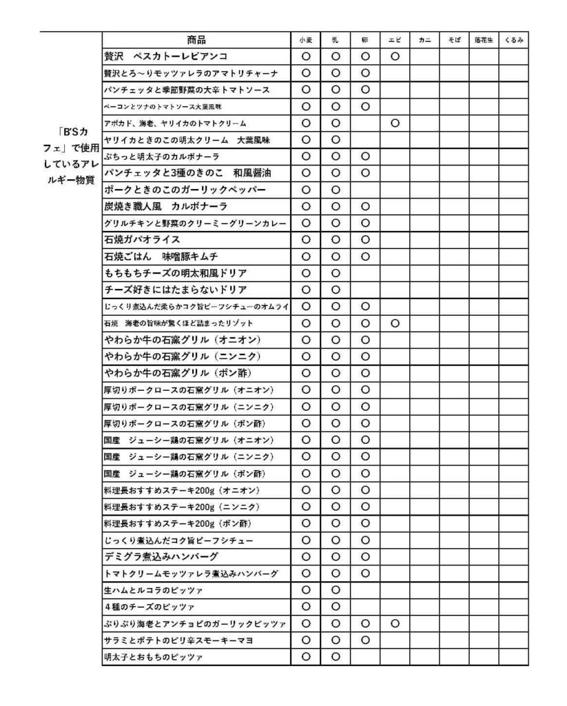 • ボストンズカフェ アレルギー情報