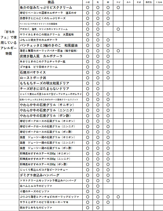 ボストンズカフェ アレルギー情報